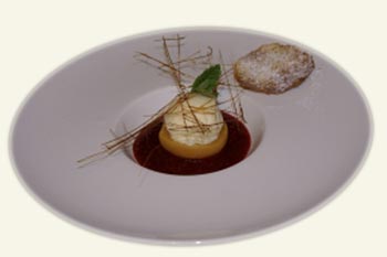 Koekje met een crémeux van mandarijn, spongecake en een chocolade ganache